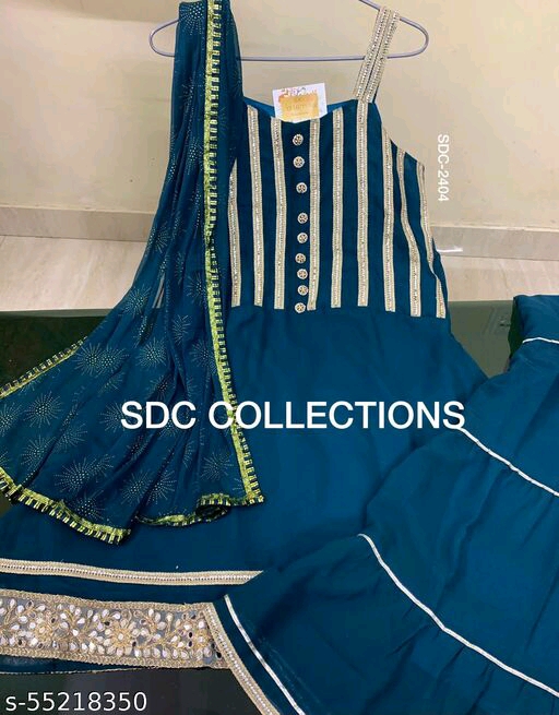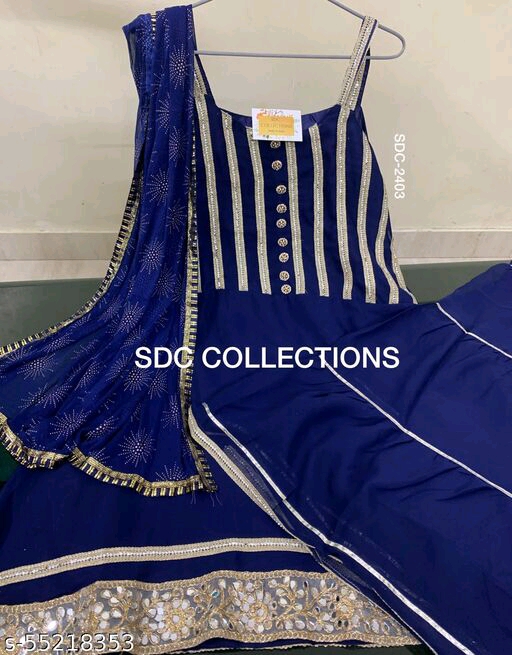 SDC-2401. Karwachauth Special launch- Elegant Pure Georgette 3 piece Kurti, Garara and 4 side Lace Chiffon Dupatta set with heavy Dabka, sequin and aari work. SET OF 3. TOP LENGTH : 45, GARARA LENGTH : 39